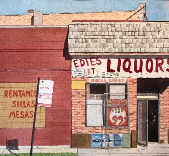 I am a Chicago-based artist working primarily with watercolor and oil paints. I’m interested in buildings, shops, and street corners, and painting as a form of preservation and historical documentation. I am a union-member and socialist, and I live in Humboldt Park.